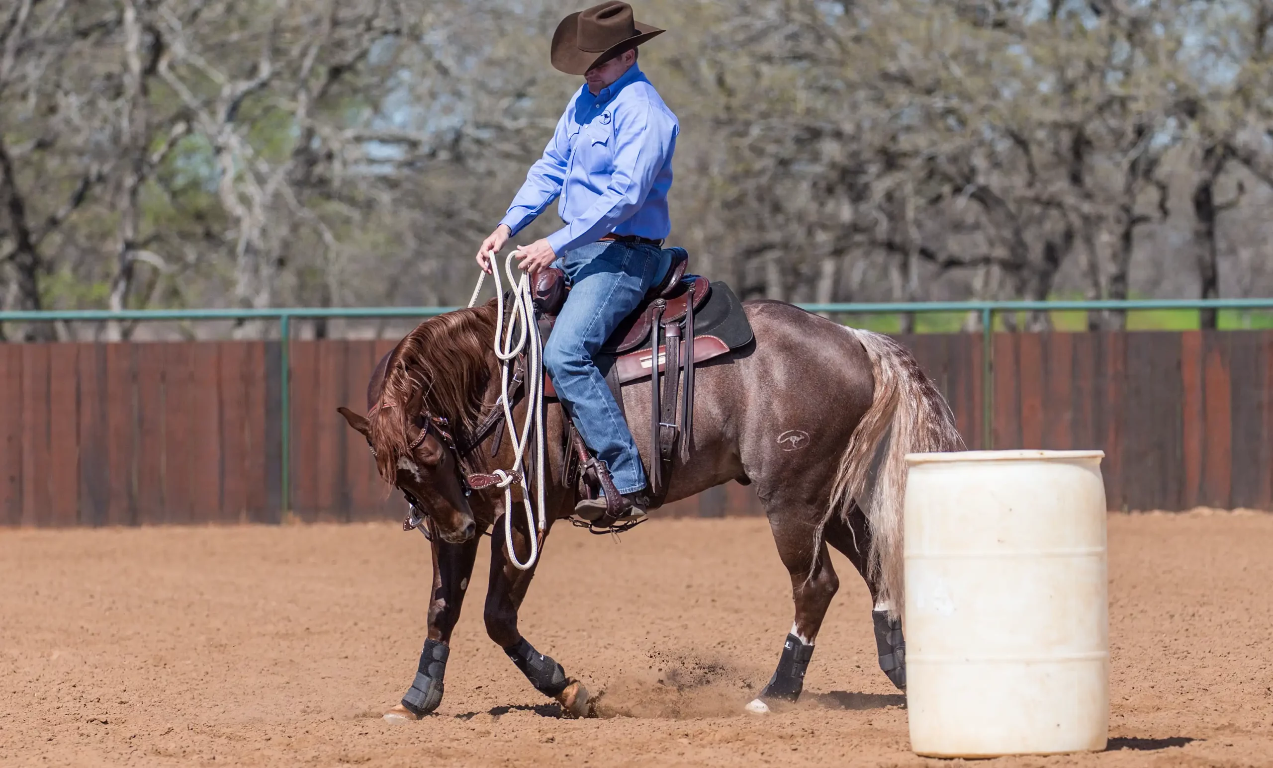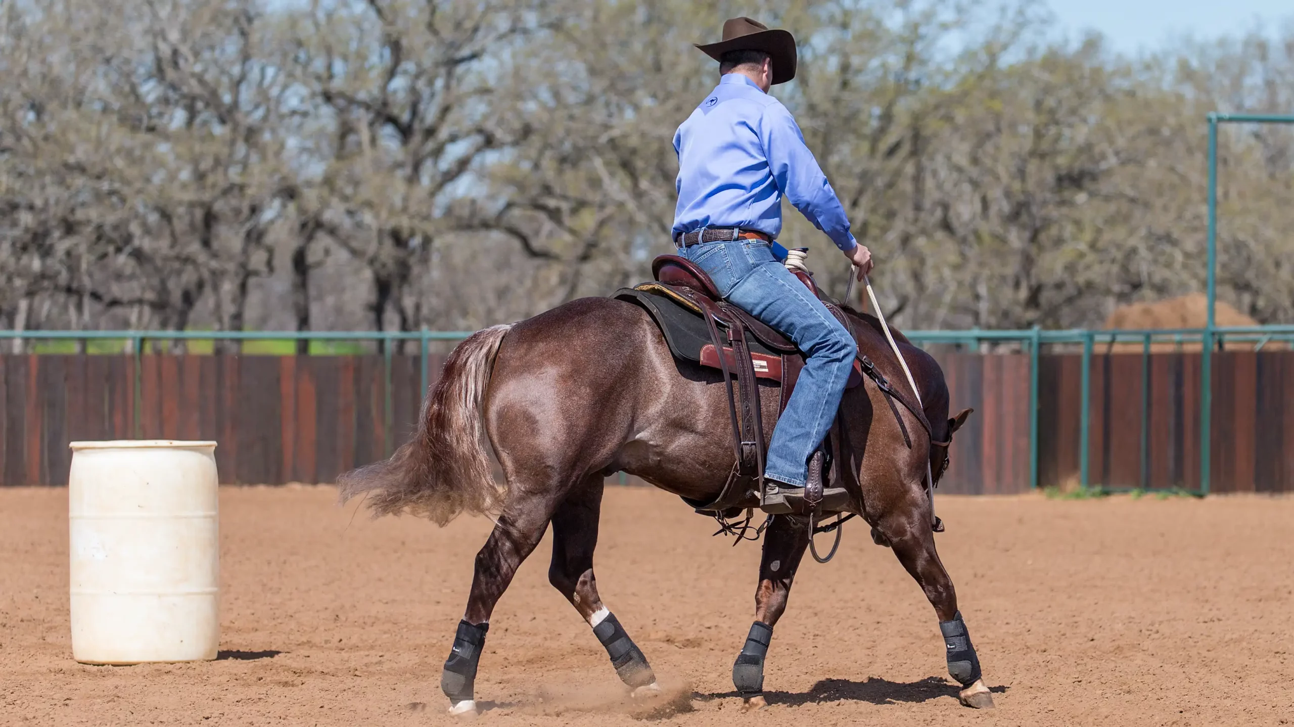 Bridle your horse up and trot a 20-foot circle around the barrel. Ask the horse to counterbend around the barrel by picking up on the direct rein and pulling it up and over so that it is in line with your belly button. The rein should just be pressing against the horse’s neck. You want to tip his nose so that you can just see his eye.