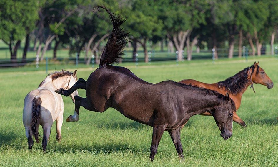 So why would a horse pin his ears or kick at others? It may be due to a lack of respect. Maybe you never taught your horse to respect you, or you’re not giving him enough to think about when you’re riding. As a result, he has time to cause trouble and worry about keeping other horses out of his personal space. When it comes to training horses and working with them on a daily basis, I figure the horse has 23 hours a day to do whatever he wants—eat, sleep, play, whatever. I only ask for an hour or two out of his day, and the least he can do is put on a good attitude and respect me while I’m with him. I make no excuses for cranky attitudes in my horses, whether the horse in question is a mare in heat or an extremely dominant horse in the herd. When I’m riding my horses, their attention and focus had better be on me.
