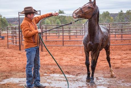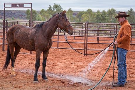 Before touching the horse with water, build his confidence by spraying the water around him first.