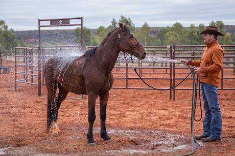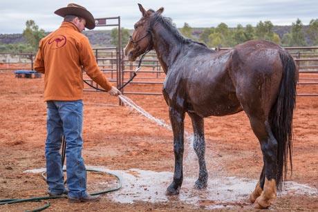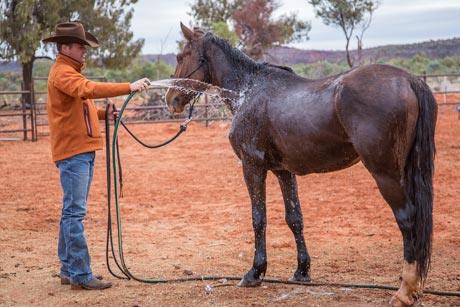 When you’re ready to spray the horse with water, start on his topline, the least sensitive area on his body.