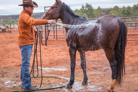 As a general rule, I start spraying the ground with water about 4 feet away from the horse’s legs. I keep the hose in the same position until the horse does two things: stands still and shows a sign of relaxing. Signs of relaxing include licking his lips, blinking his eyes, taking a deep breath, cocking a hind leg, lowering his head and neck or standing still for at least 15 seconds. As soon as he does both of these things, take the hose away and rub him with your hand.