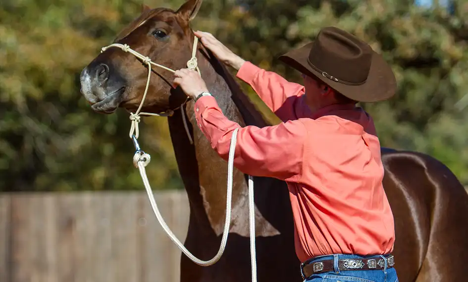 You’ll get your horse over his fear by desensitizing him to your hands touching his ears using the Approach and Retreat Method. You’ll start by rubbing your horse’s body in an area he’s comfortable with and then gradually working your way to his ears. By approaching him and then retreating when he stands still and shows a sign of relaxing, you’ll build his confidence. When a horse relaxes, he’ll do one of five things: he’ll lick his lips, lower his head, blink his eyes, cock a hind leg or take a big breath. When he stands still and shows one of these signs of relaxing, you’ll retreat and go back to rubbing him in a spot he’s comfortable with, such as his neck or withers. Sometimes a horse won’t show you any of these signs, but as long as he stands still for 15 seconds, you can take away the pressure. If a horse stands still for 15 seconds, he’s telling you that he’s not interested in running. He may still be a little frightened, but he’s starting to use the thinking side of his brain and has chosen to stand still.