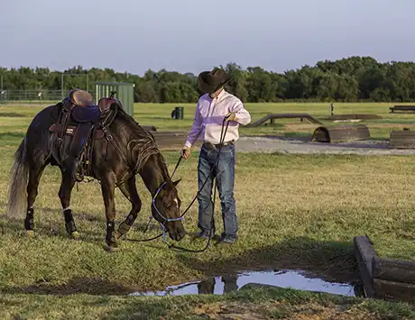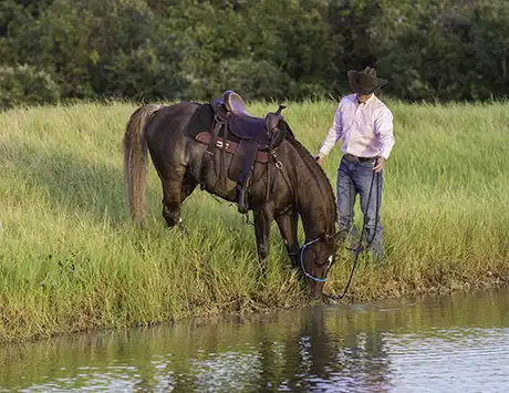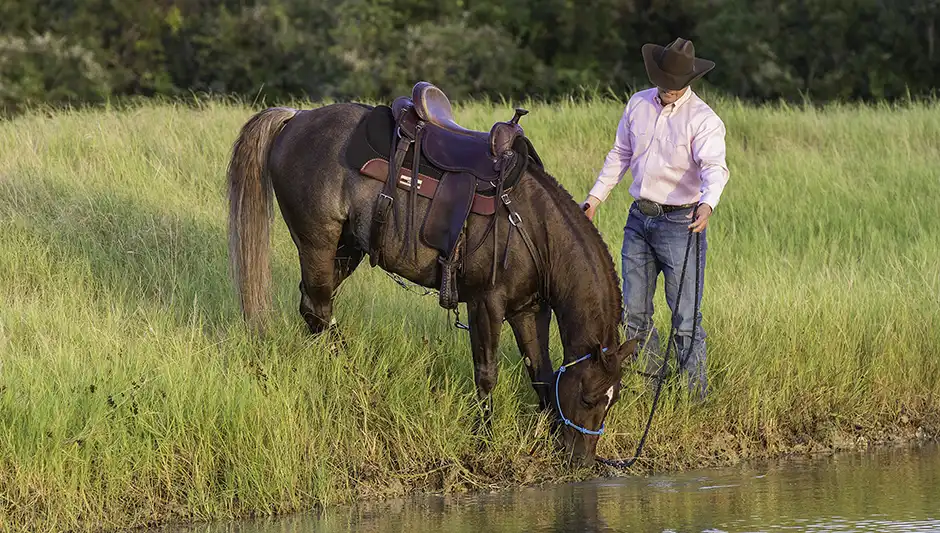We teach our horses to crave water at the ranch by letting them rest in a pond at the end of training sessions.