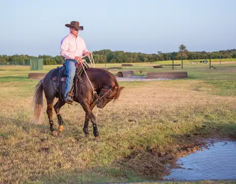 When a horse is frightened of something, his instinct is to get away from whatever is scaring him. In this situation, you’ll use that fear to your advantage. The more fearful your horse is, the more he’ll suck back and want to get away from the water. That fear will cause him to really sit back on his haunches as you roll him back, which helps to improve the maneuver. So as long as he wants to suck back, use that in a positive way.