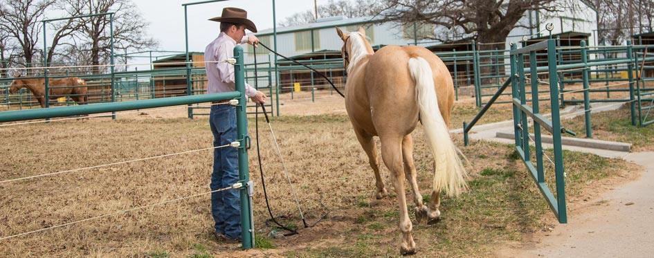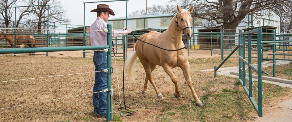 When you reach the pasture, send the horse back and forth through the gate. Initially, keep the gap wide to build the horse’s confidence. Gradually close the gap until you’re able to send him in between a 4-foot opening.