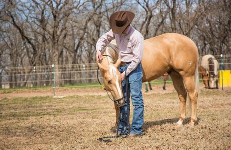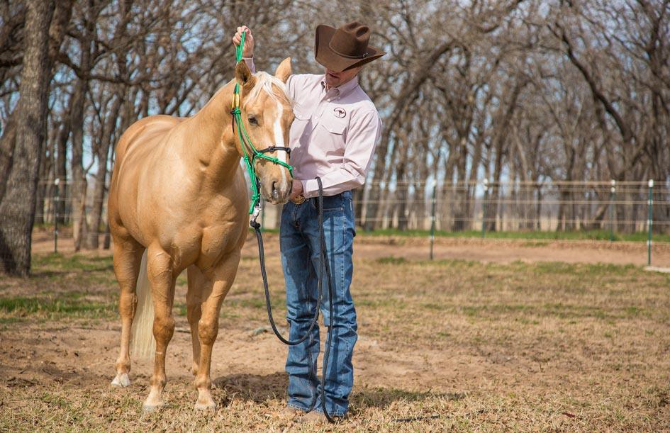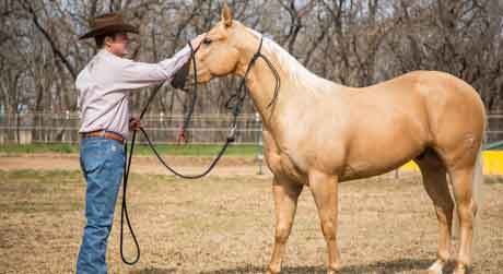 Practice taking an extra halter off the horse. If he tries to run away when he feels the halter coming off, immediately pull on the lead rope to get two eyes. As soon as the horse faces you, release the pressure.
