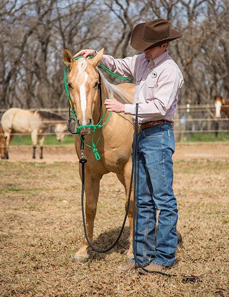 Practice the same technique with the halter tied around the horse’s neck. When he faces you with two eyes, be sure to rub him and make him feel comfortable for facing you.