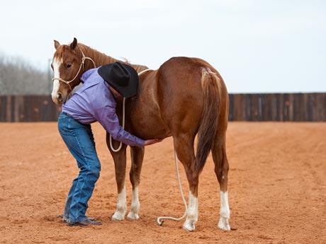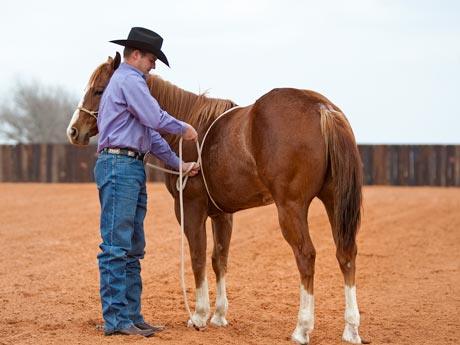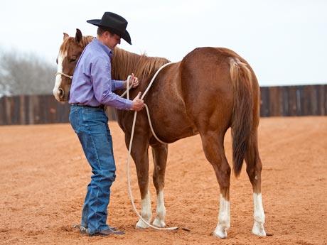 Repeat this exercise, squeezing the rope tight, then releasing it, until you work up to the point where the rope is as tight you can make it, and your horse just stands there and ignores you. Perform this exercise where both your front and back cinch would be. (Remember, as you get toward the back cinch area to have the horse’s nose tipped toward you in case he tries to kick or overreact so you can quickly turn his hindquarters away from you.)