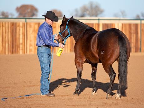 First, work through the exercises from my DVD series, Gaining Respect and Control on the Ground I and II, to get your horse using the thinking side of his brain and to increase his respect. Then, use my Approach-and-Retreat Method — first with a rope, then with the saddle.