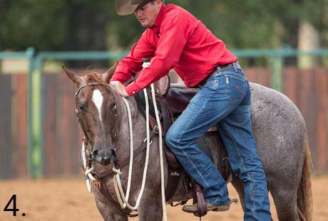 4. Then put the horse on a big, loose rein and slip your foot into the stirrup and act as if you’re going to get in the saddle. It’s important to put the horse on a loose rein so that you’re not protecting him by making him stand still. Dare him to make the mistake. If you babysit him, he’ll never learn to be responsible.