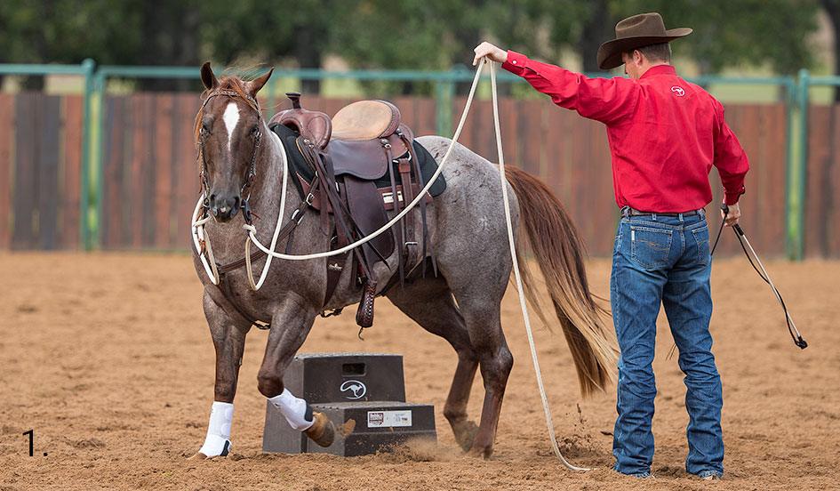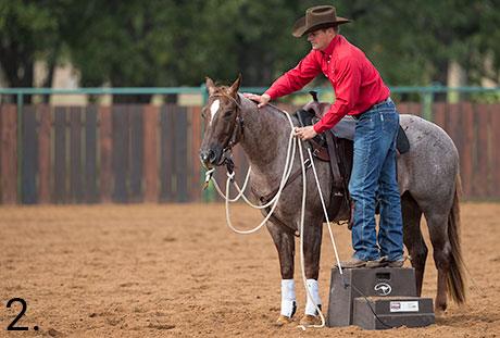 1. If you use a mounting block to get on your horse, start by first moving his feet all around the mounting block. Send the horse between you and the mounting block. Stand about 10 feet away from the mounting block and direct the horse’s feet from one side of you to the other. Do this exercise on all four sides of the mounting block. Make the horse hustle his feet the entire time. You want him to think about where he’s putting his feet and get him to tune in to you.