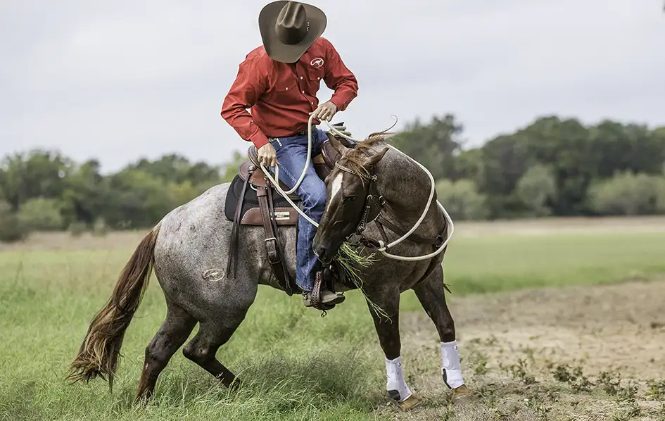 If your horse grabs a mouthful of grass, immediately put his feet to work. Make him HUSTLE!
