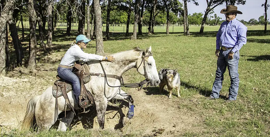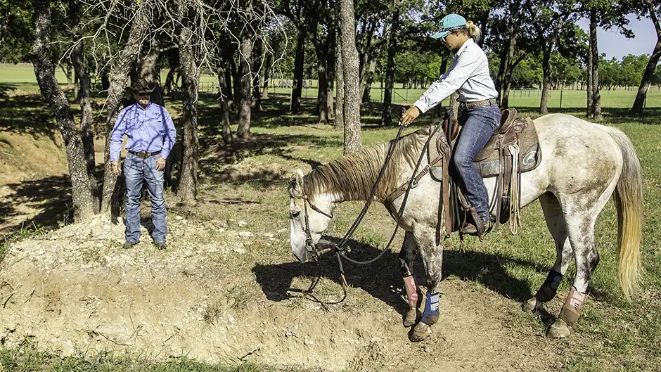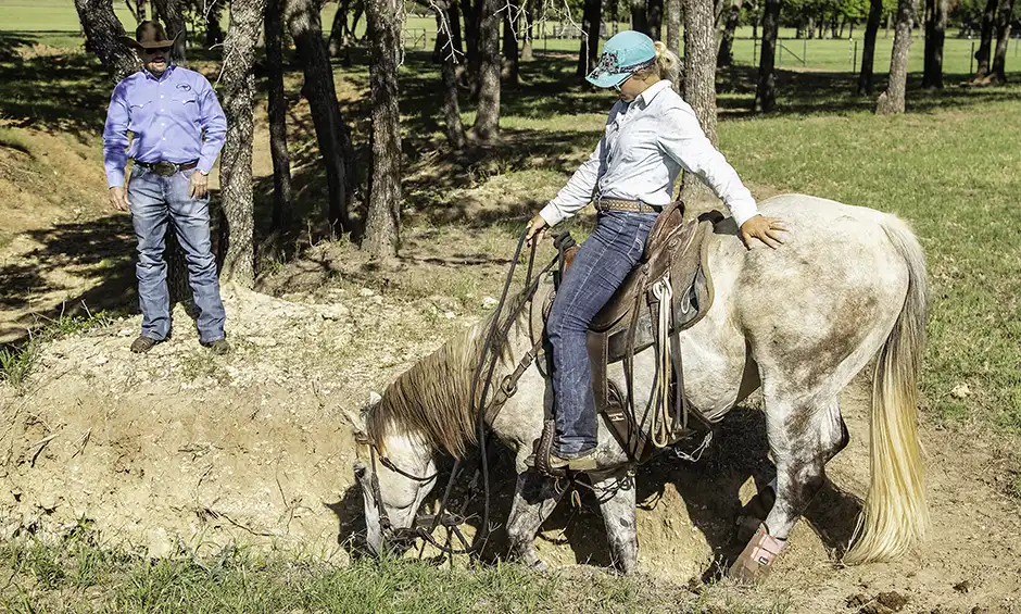 When the class was ready, I worked with Alicia to demonstrate how to teach a horse to properly negotiate hills. When I ask a horse to go up or down a hill, I want him to creep and think about where he’s placing his feet. That’s the complete opposite of a horse that scrambles down a hill, building speed, or one that bolts up an embankment. A horse that pays no attention to how he goes up or down a hill is one that’ll get you into a bad wreck.